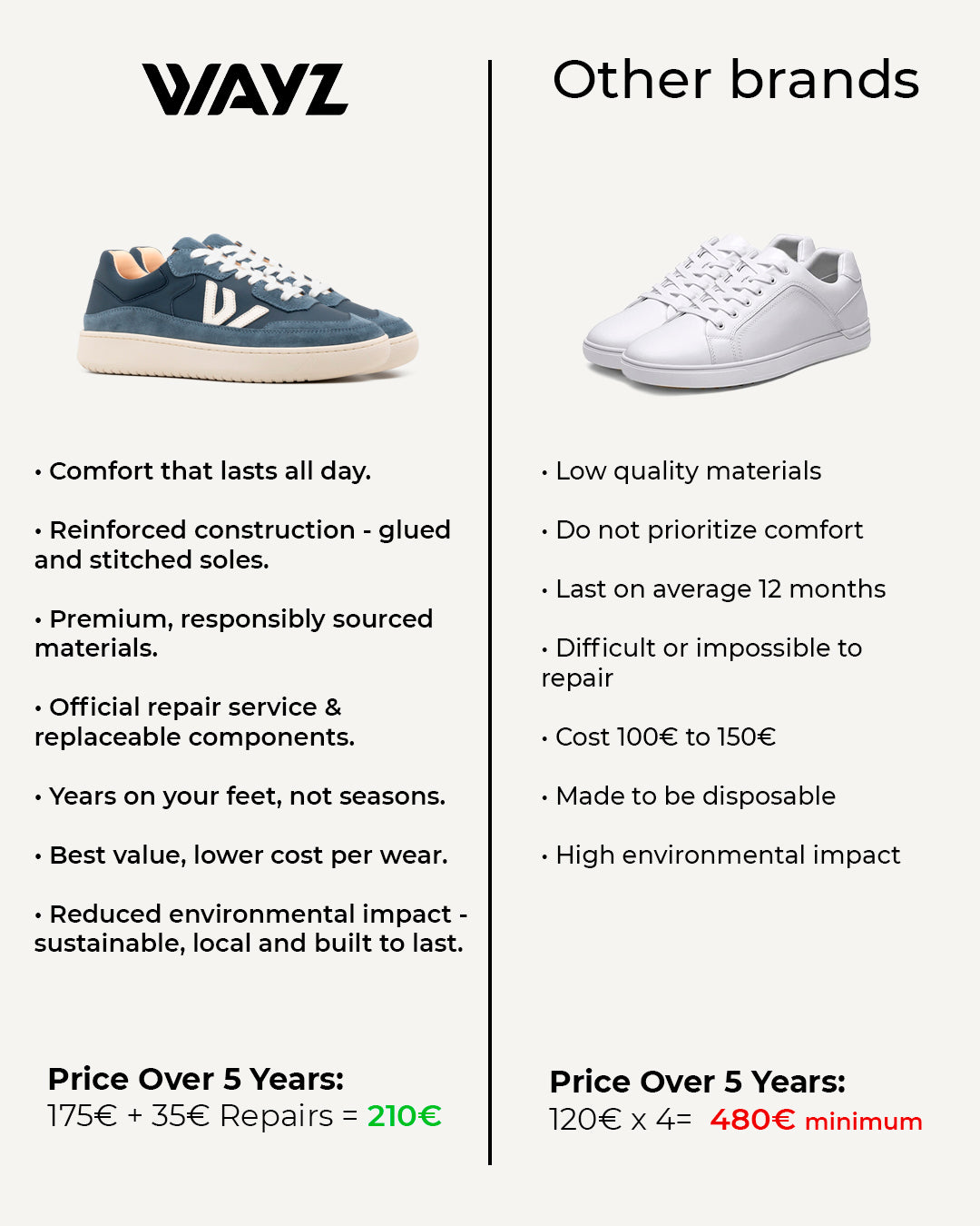 Wayz are built to walk with you for many years. How many, it depends on how you take care of them. Crafted with strong materials and reinforced construction, they’re designed to endure daily life — not just a season. And when time leaves its marks, our repair options (new outsole, new insole, repair stitches, etc) help extend their journey even further.